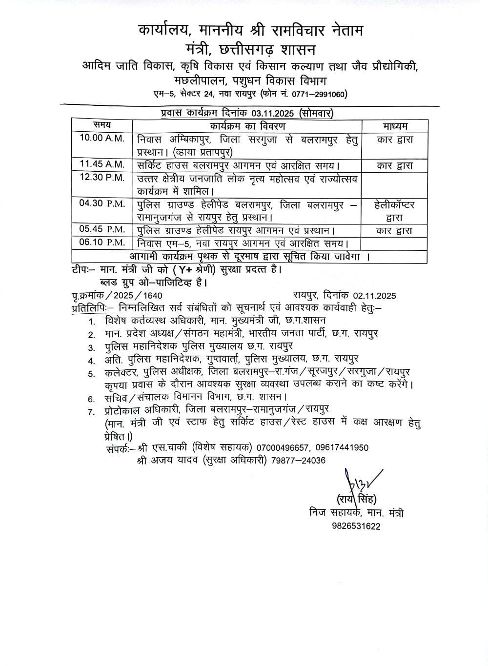 कार्यक्रम में क्षेत्रीय कलाकारों की पारंपरिक प्रस्तुतियां और छत्तीसगढ़ी लोकगीतों की प्रस्तुति रहेगी, जिसमें प्रसिद्ध छत्तीसगढ़ी गायक सुनील मानिकपुरी मंच पर अपनी प्रस्तुति देंगे। प्रोटोकॉल के अनुसार मंत्री नेताम शाम 4.30 बजे पुलिस ग्राउंड हेलिपैड बलरामपुर से हेलीकॉप्टर द्वारा रायपुर के लिए प्रस्थान करेंगे और शाम 5.45 बजे रायपुर पहुंचेंगे।