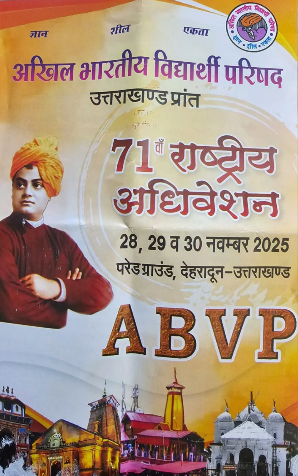 अभाविप के उत्तराखंड अधिवेशन का लोगो और पोस्टर जारी कर दिया गया है। आगामी 28, 29 तथा 30 नवंबर को आयोजित हो रहे अखिल भारतीय विद्यार्थी परिषद के 71वें राष्ट्रीय अधिवेशन के निमित्त परेड ग्राउंड में अधिवेशन स्थल पर 71 वेदपाठी पुरोहितों द्वारा वैदिक वेद मंत्रों के साथ भूमि पूजन पिछले सप्ताह किया गया।